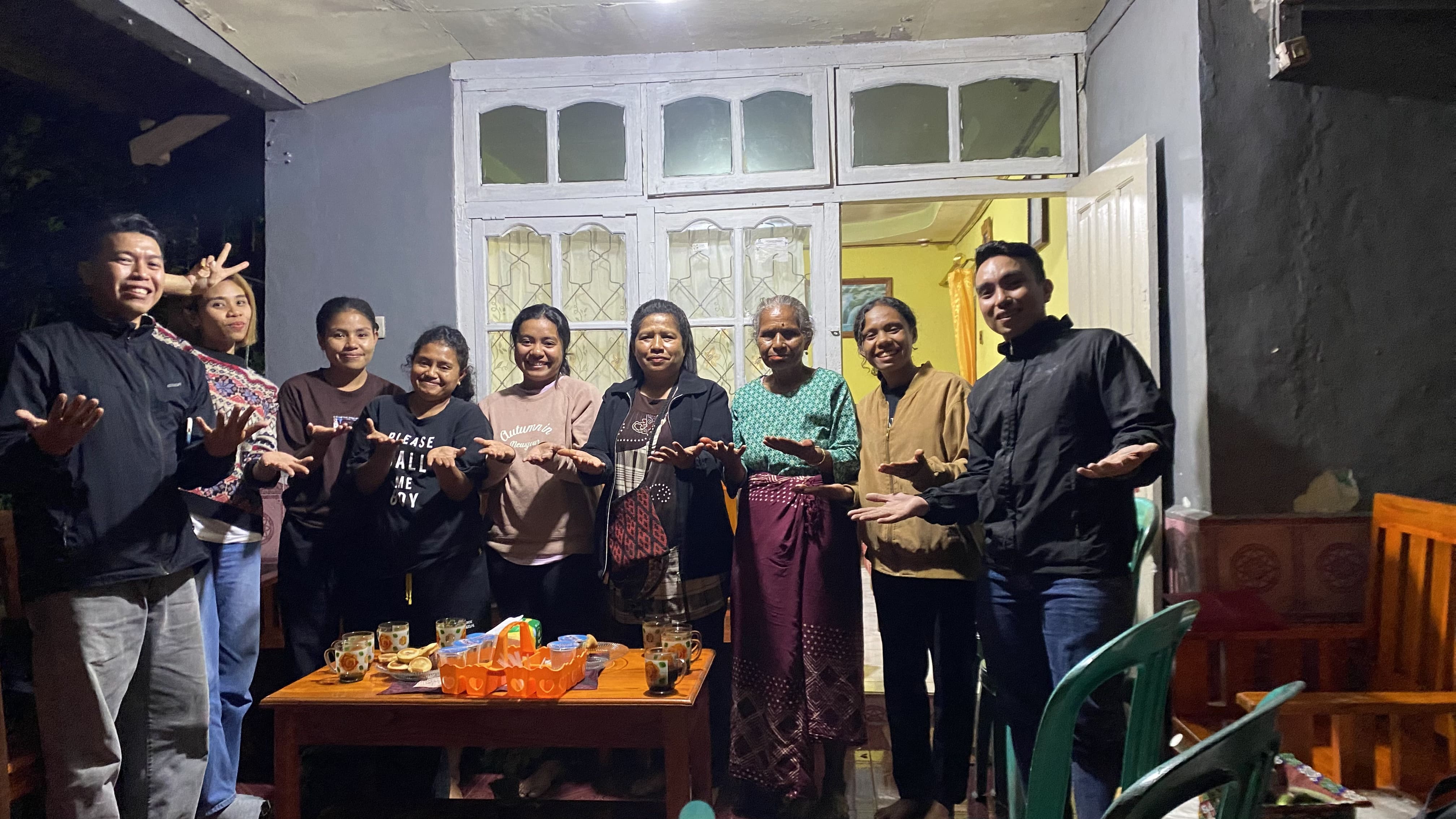 The Kopernik team together with the farmers of Kuatae, at the home of Mama Vero and Kaka Deby, which is currently serving as a gathering point for farmers affected by the disaster.